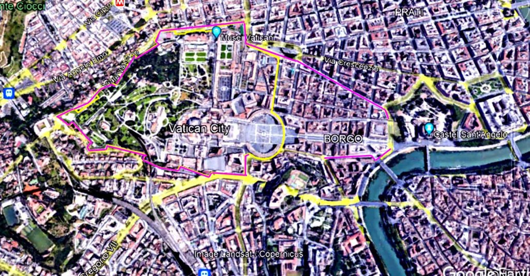 The Tiber River flows to the east of Vatican City, and you can see the city of Rome beyond.