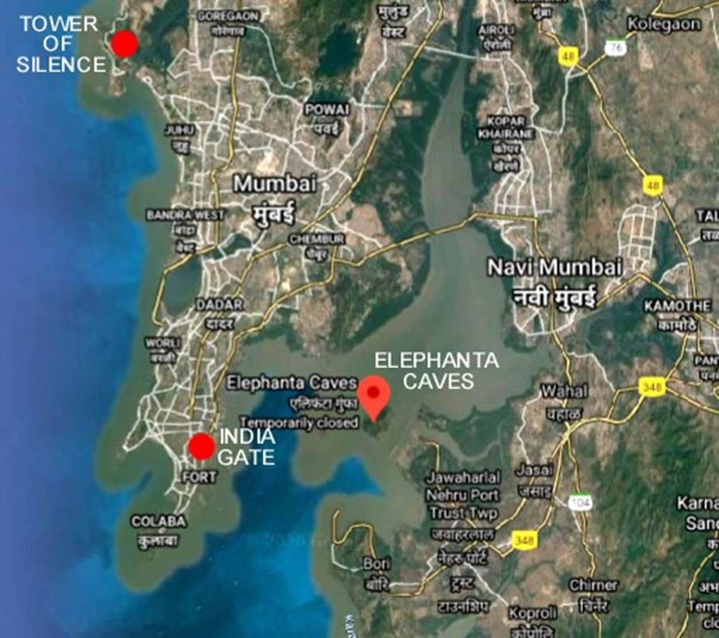 Below: Positional relationship between the India Gate and the Elephanta Caves.