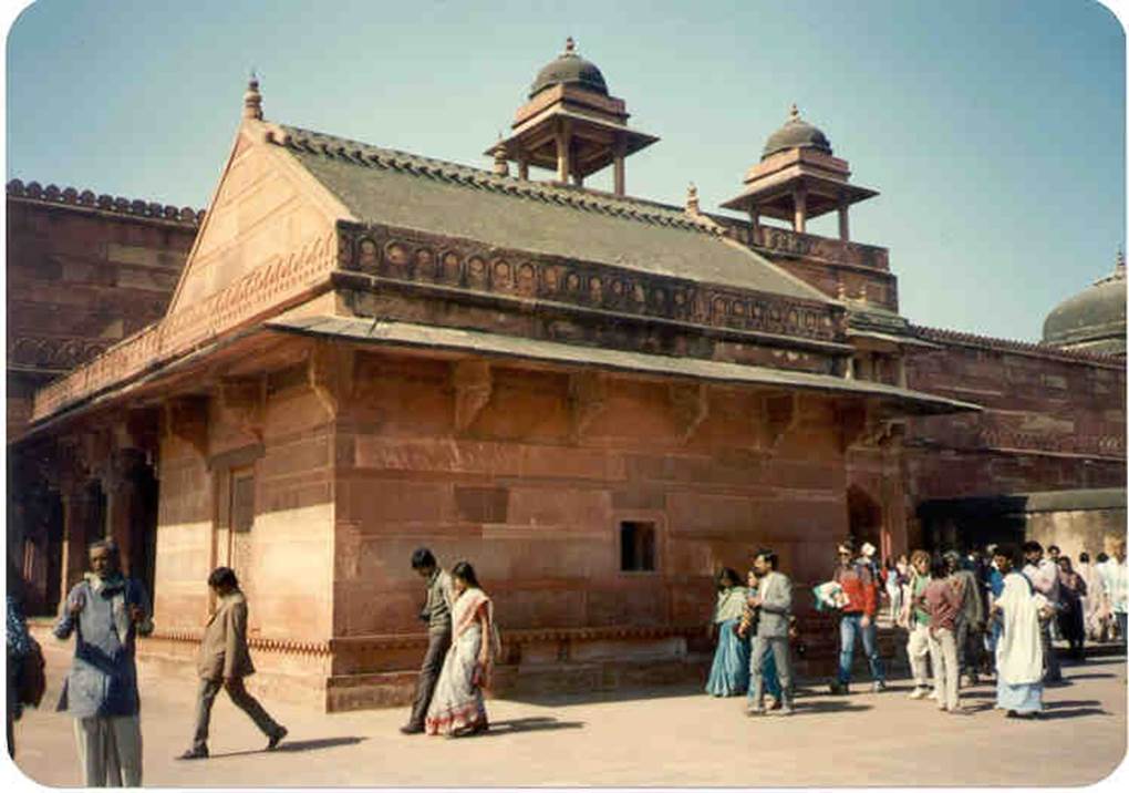 The residence of Emperor Akbar’s favorite minister, Birbal. Deep eaves for awning, called chaj as, cover all four sides. Birbal is a Hindu, so the building is designed for him. Adjacent to it are the palace’s own camel and horse stables.