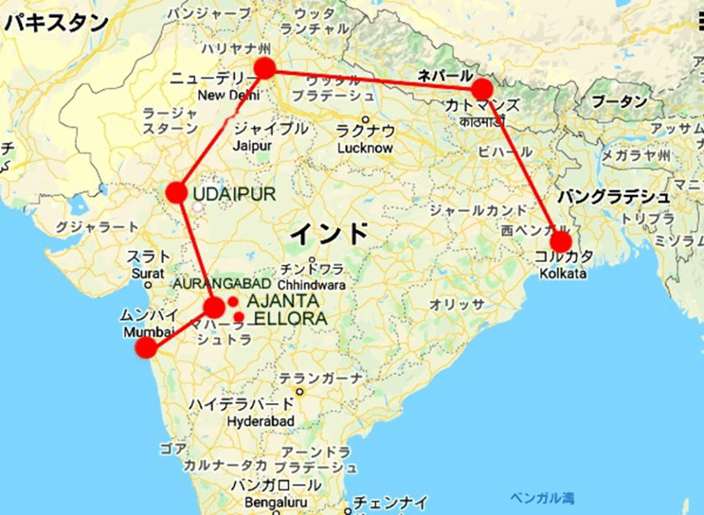 1 night in Kolkata, 3 nights in Kathmandu, 2 nights in Delhi, 3 nights in Udaipur, 2 nights in Aurangabad