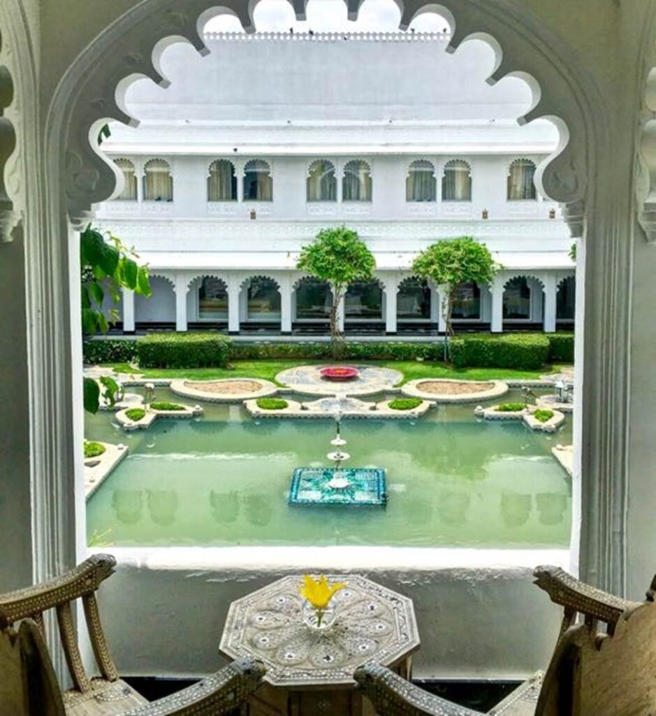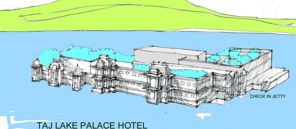 The hotel (formerly known as Jag Niwas Palace) is a palace built of white marble on a small island (Jag Niwas) in Lake Pichola.