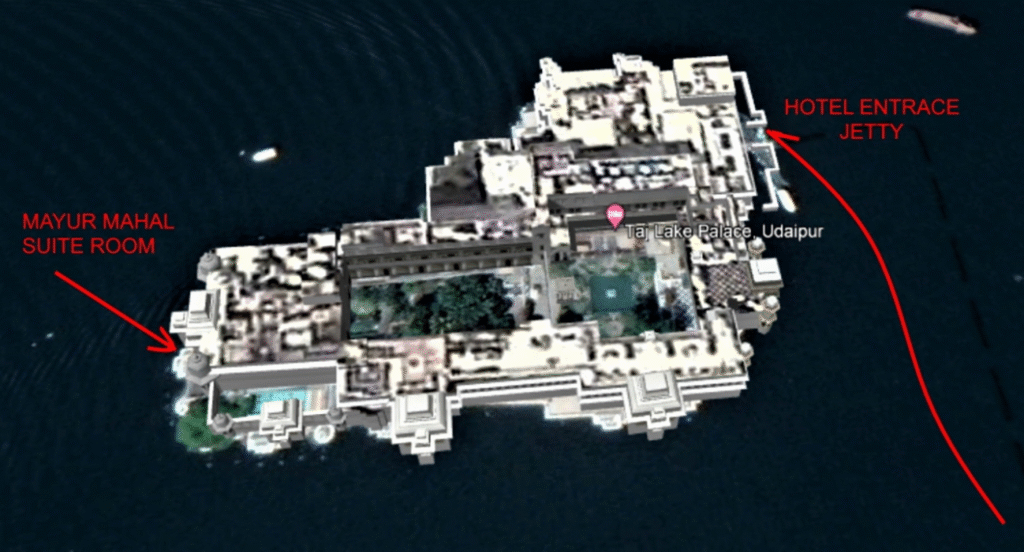 The Taj Lake Palace Hotel is only accessible by water, from a small private wharf at the foot of the City Palace walls.