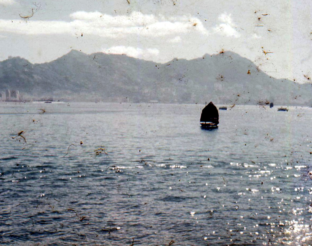 A rare junk ship, with Diamond Head on the Kowloon side in the background. Photo by author, June 1962