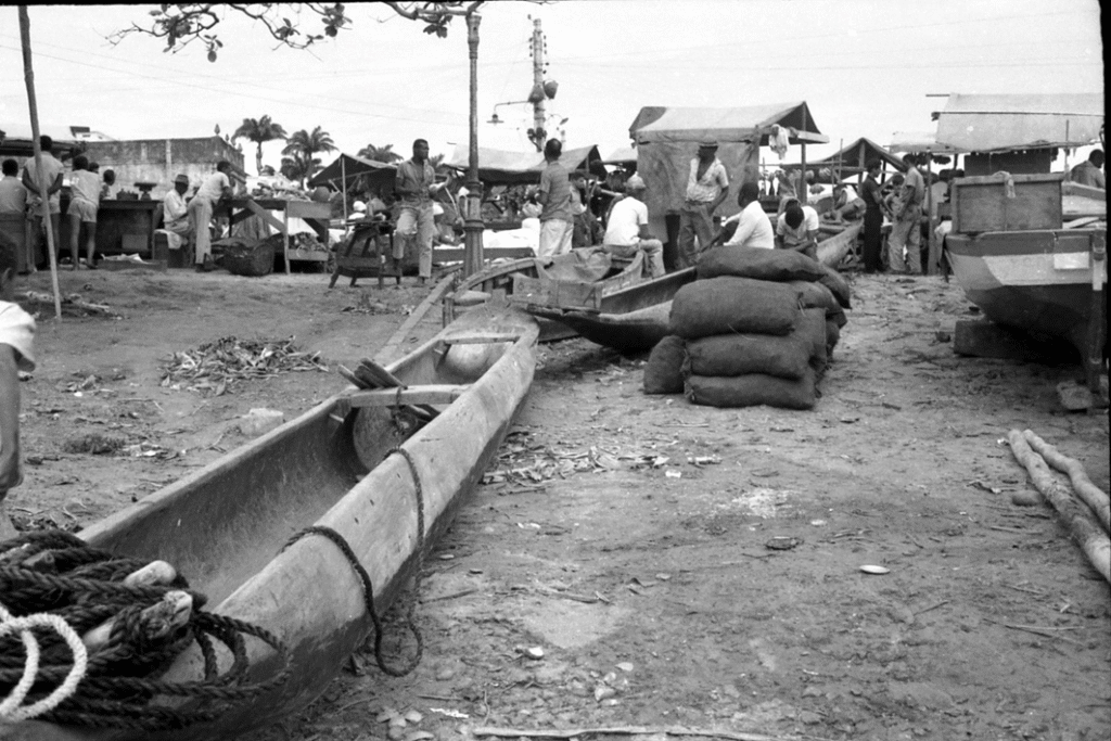 A round boat carved out of a giant tree. Rope made from natural materials. Bags made from jute.