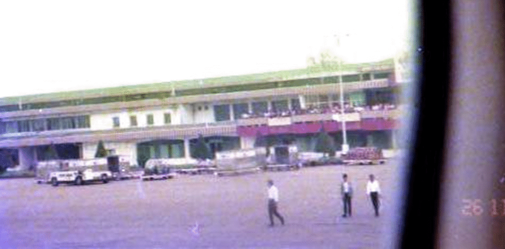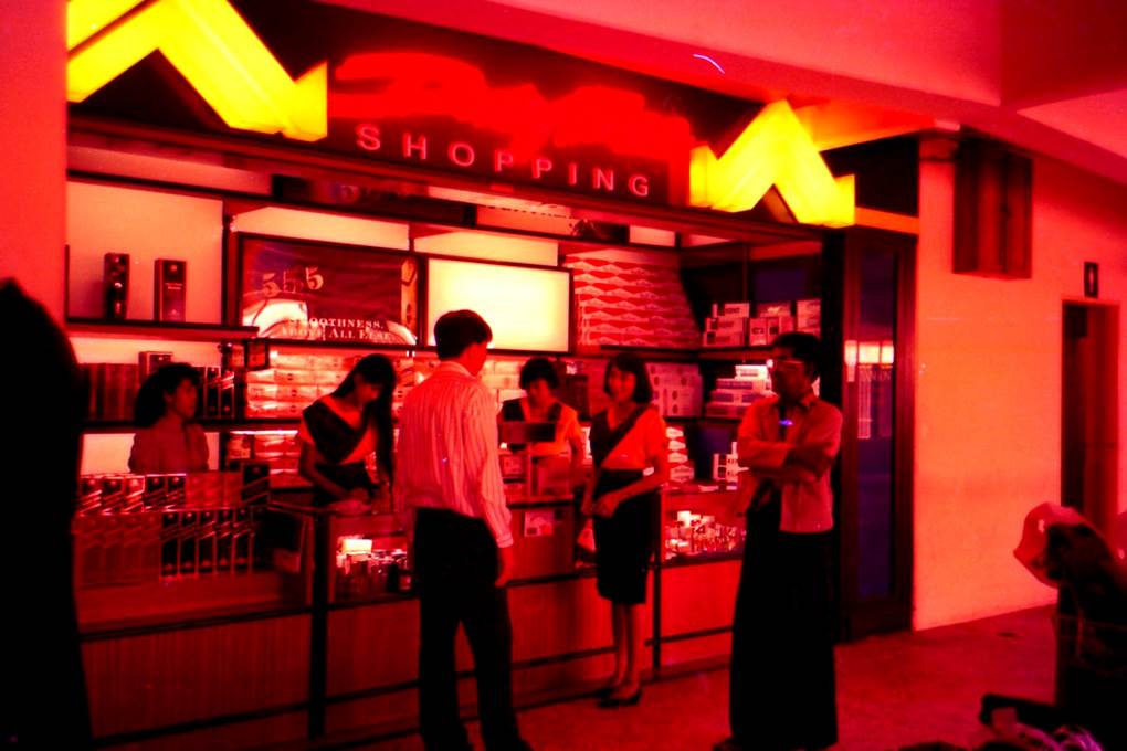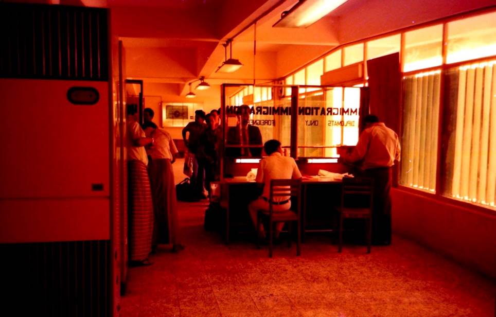 Arrival at Yangon Airport. By 1993, airports without air bridges were becoming rare in Southeast Asia. The terminal building is old, like airport in Jakarta in the 1970s.