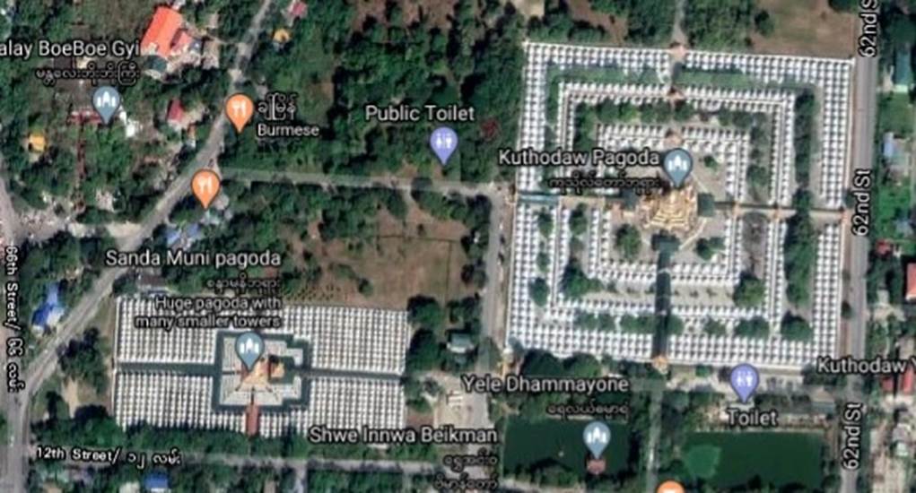On the right is Kuthodaw Pagoda and on the left is Sanda Muni Pagoda.