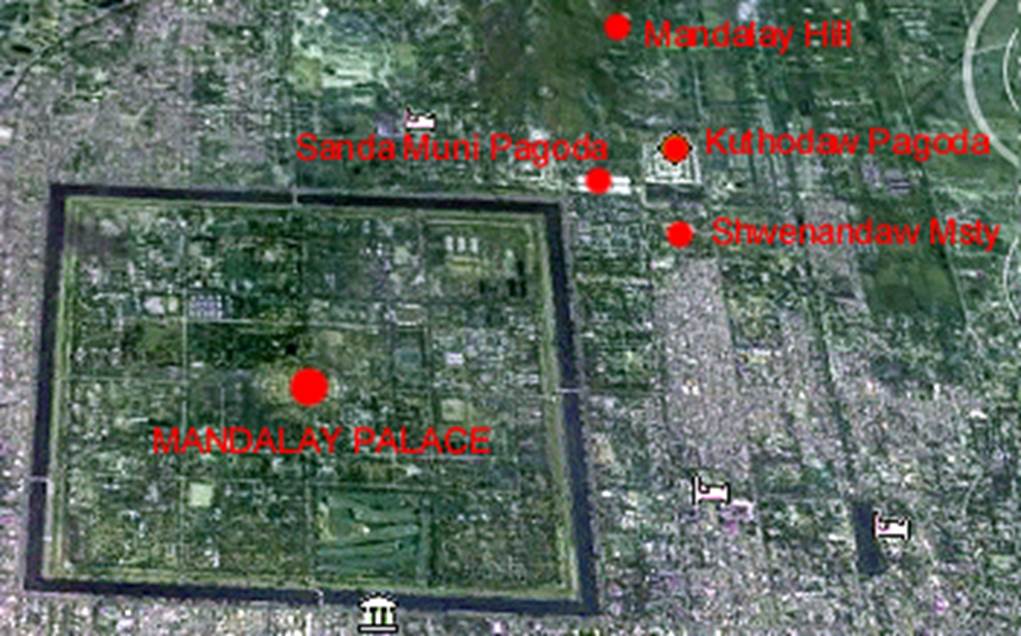 On the right is Kuthodaw Pagoda, on the left is Sanda Muni Pagoda, and in the background on the left is Shwenandaw Monastry.