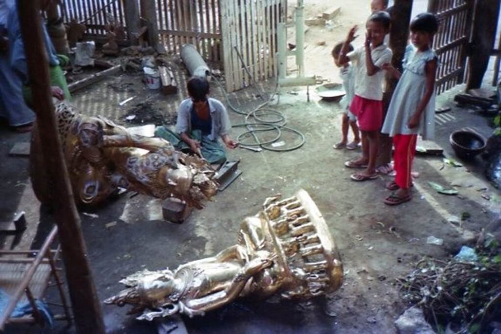 The finished golden Buddha statue is placed on the dirt floor. It’s a work of art.
