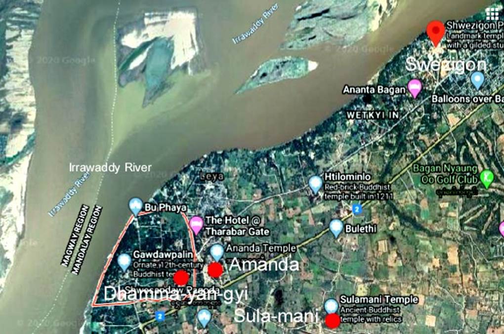 Bagan is located on the east bank of the Irrawaddy River, 180km southwest of Mandalay, about a three-and-a-half-hour drive from Mandalay.