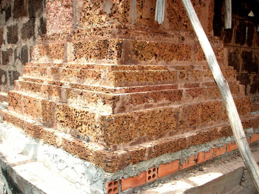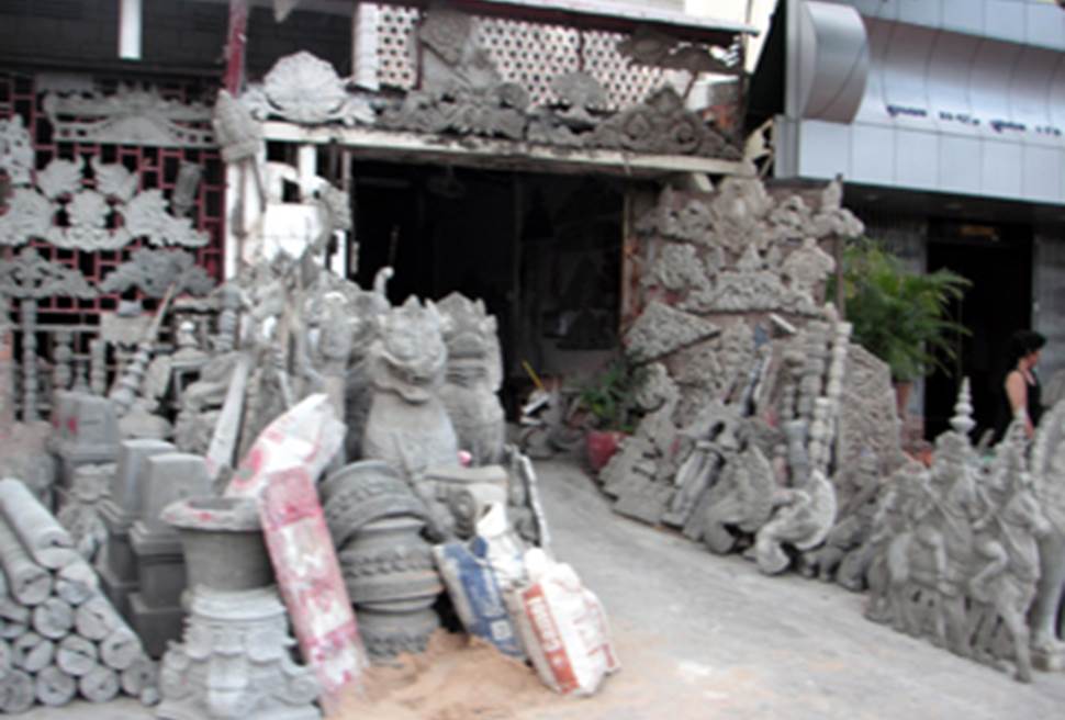 The base of the building is made of a material similar to the one found around Angkor Wat.