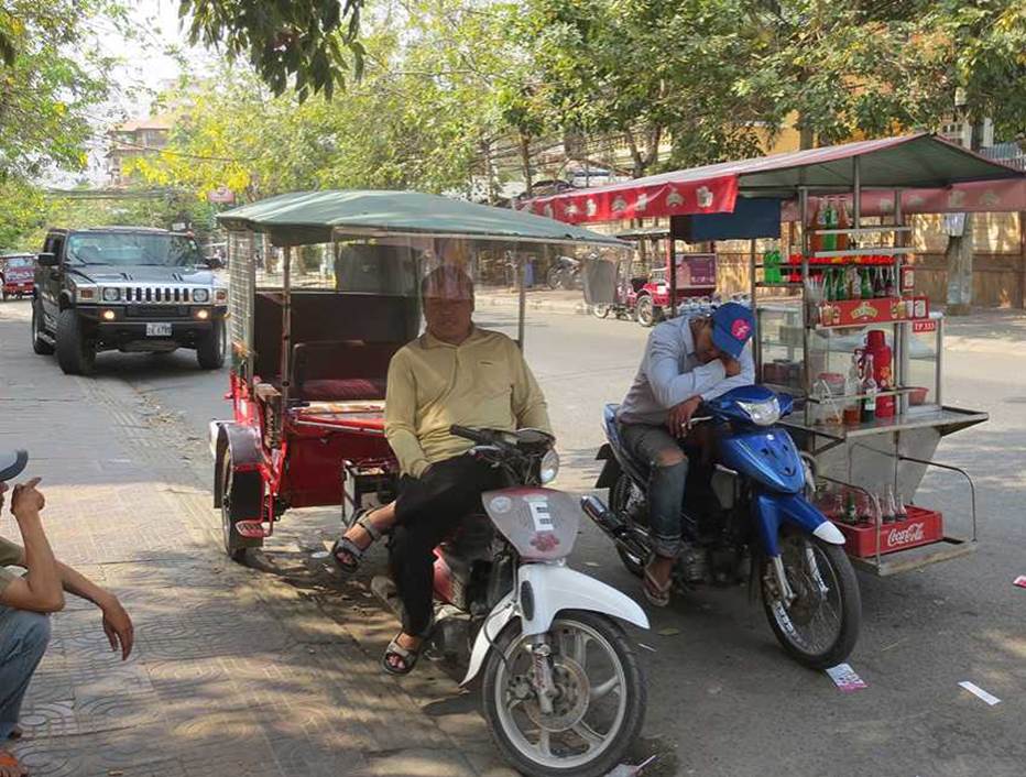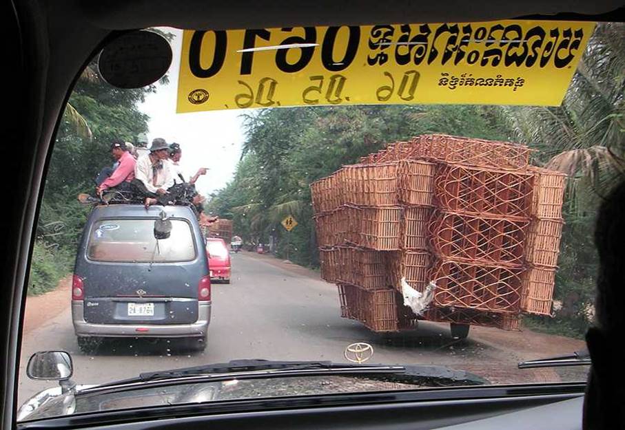 Between Phnom Penh and Angkor Wat, drive at breakneck speed on the national highway. A long-distance minibus with several passengers on its roof is overtaking a truck carrying bamboo baskets! Cars in Cambodia, Thailand, Myanmar, and Vietnam all drive on the right side of the road.