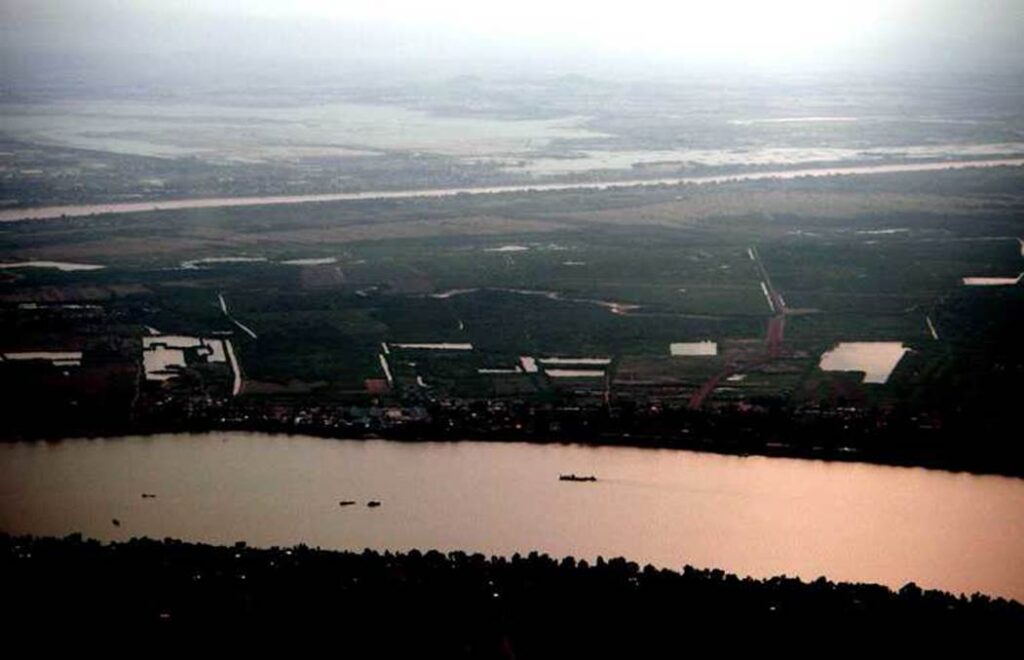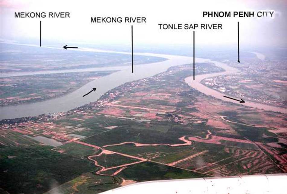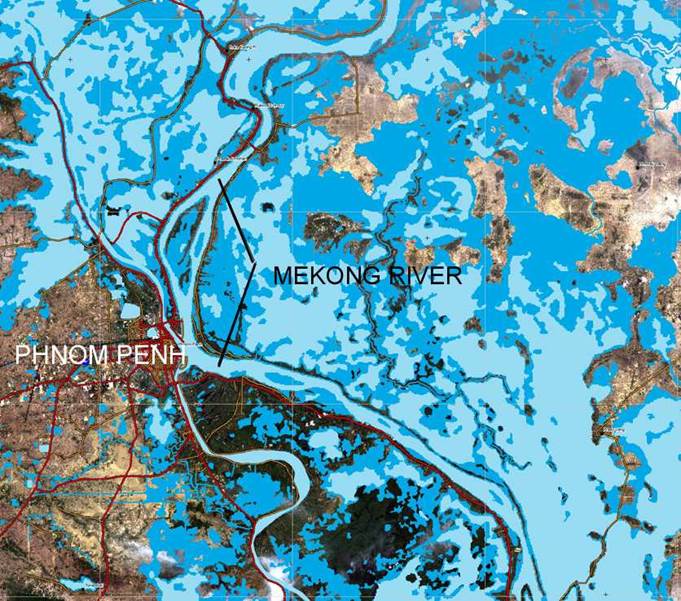 The confluence of the Mekong River and the Tonle Sap River and the area around Phnom Penh during the dry season.