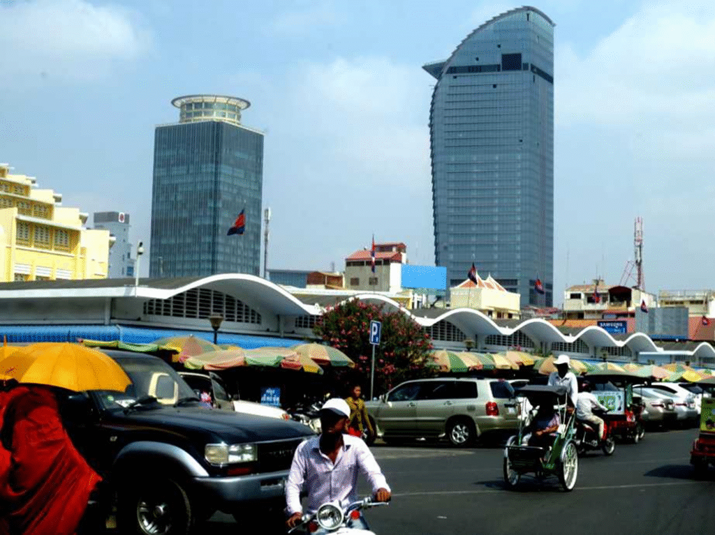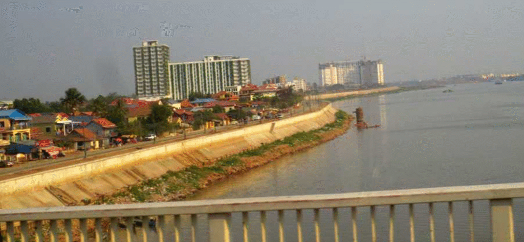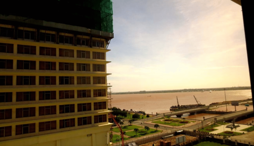 Two office towers appeared in the center of the city, behind the wharf in Phnom Penh.