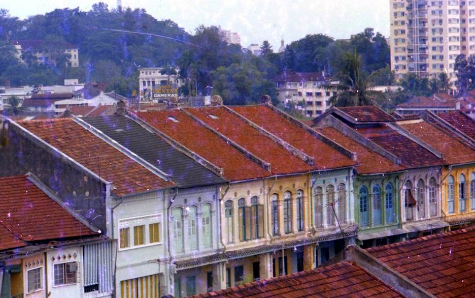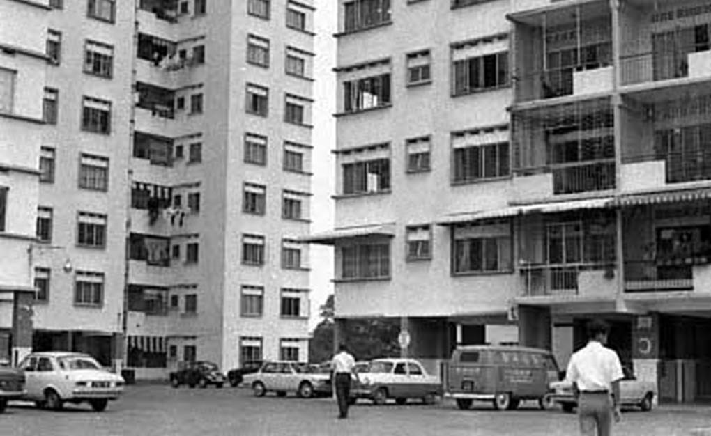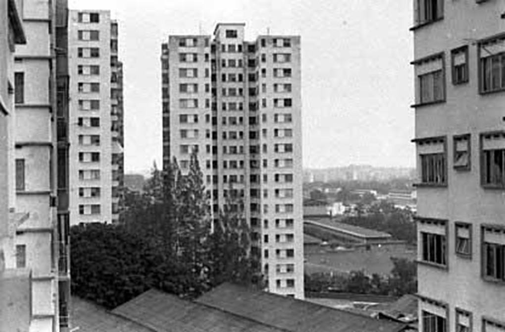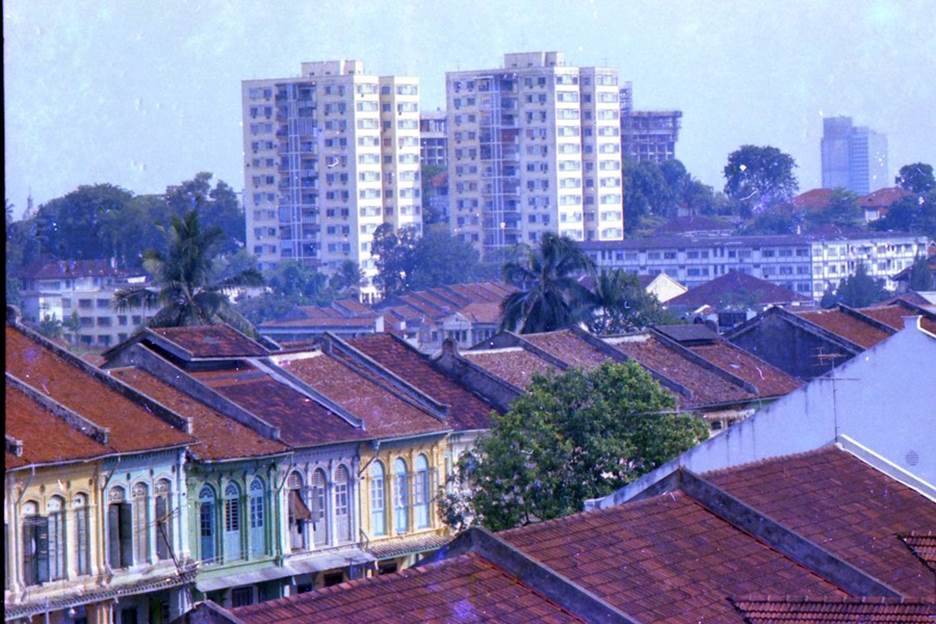 The green highland in the back is Fort Canning Hill. The two buildings in the center were apartment buildings, which were still few at the time.