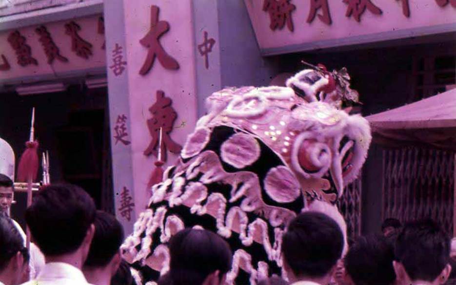 During Chinese New Year, groups of lion dancers performed in front of each store for a fee, creating a lively atmosphere.