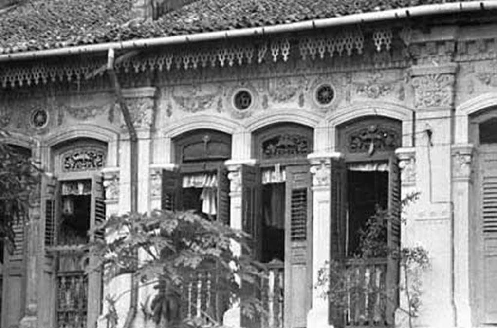 The façade of the second floor of a shophouse in Chinatown, Singapore
