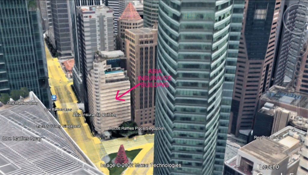 In 2022, when I searched for the former Asia Insurance Building on Google Earth, I found that it was barely remaining in the valley of the building.