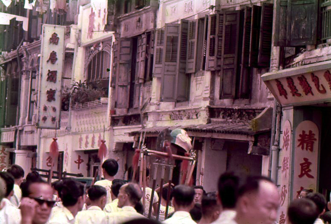 A family gathers on the road in front of a shophouse in Chinatown, Singapore