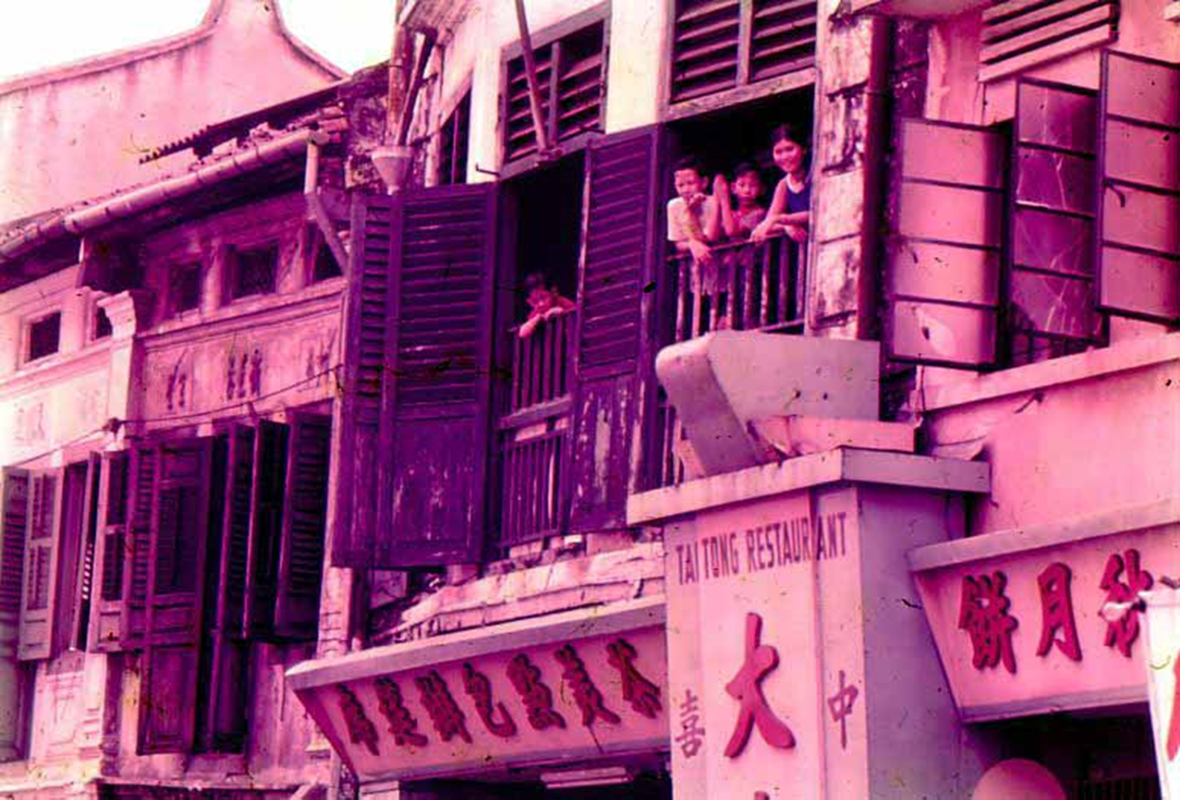 A resident looking out from the second floor of a shophouse in Chinatown, Singapore