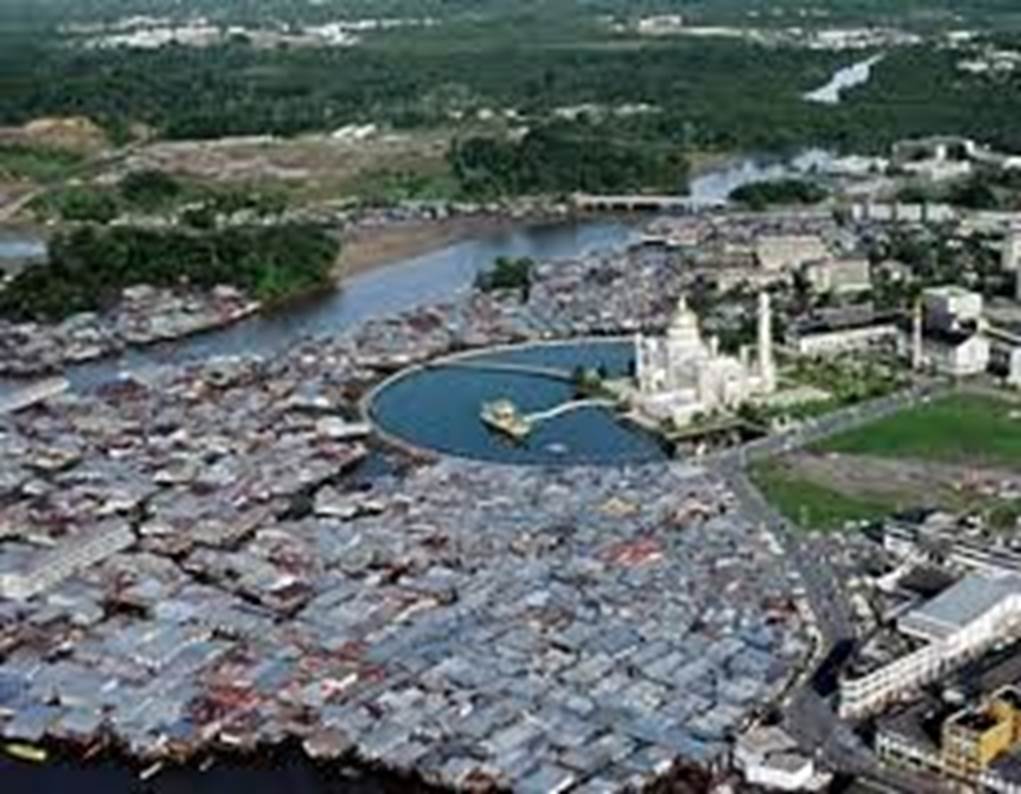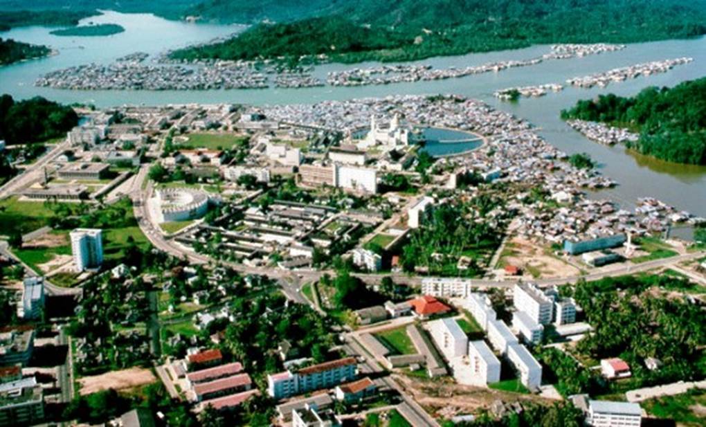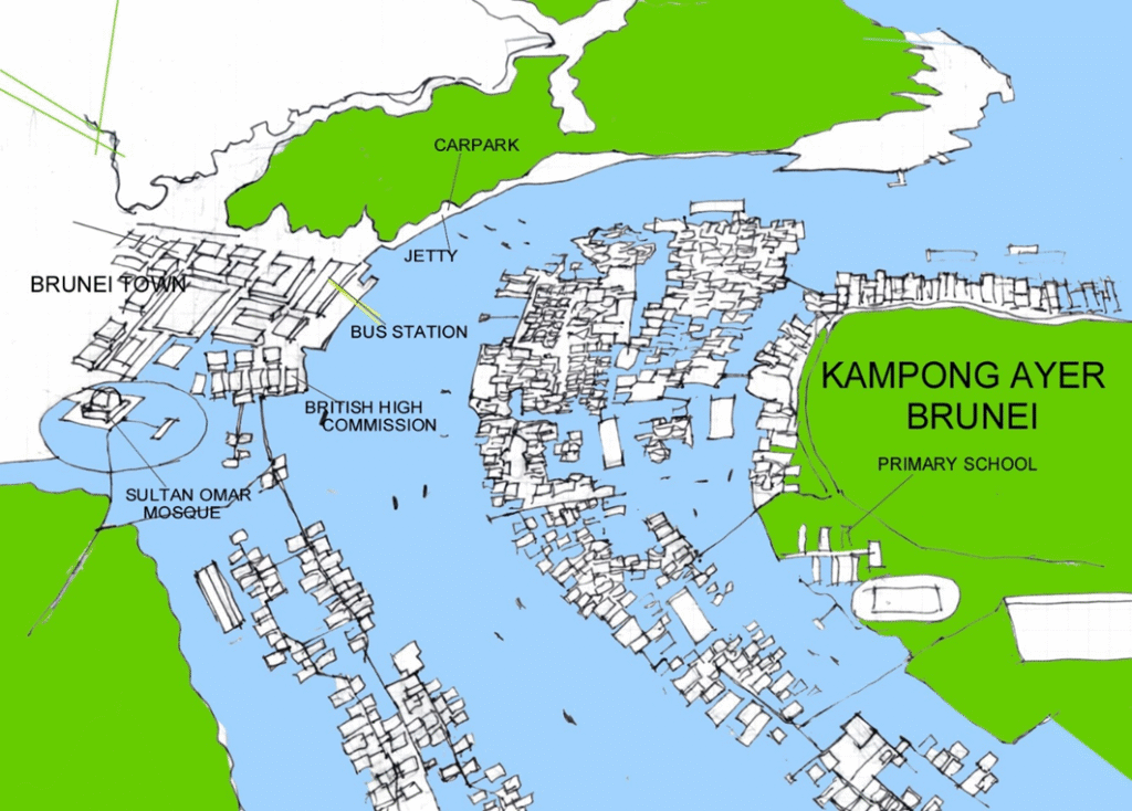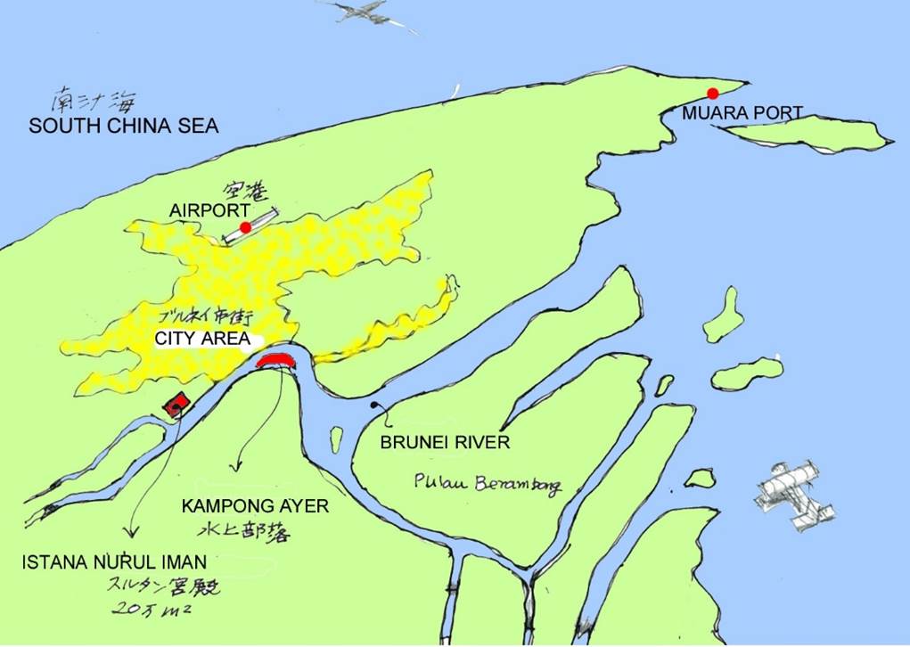 The city (yellow part on the map) has developed on land, with the floating villages developing from the Brunei River at the center.