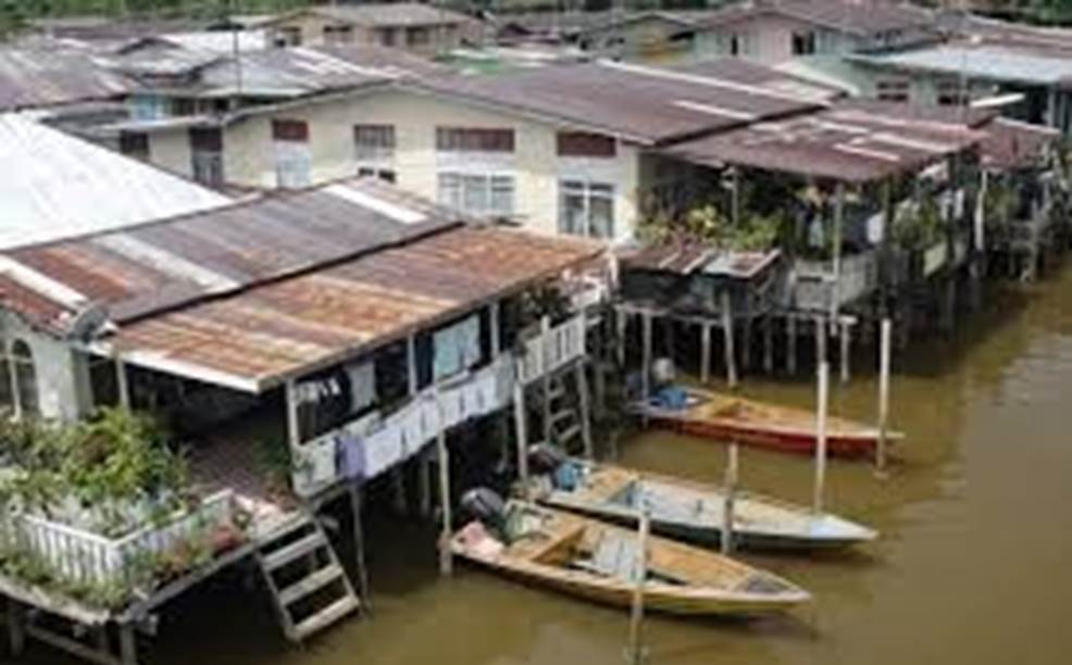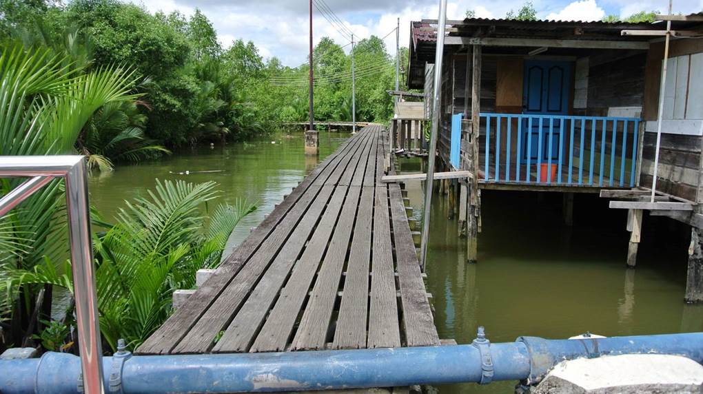 People can freely travel between the homes and boardwalks by water transport, such as speedboats with engines, under the high stilts.
