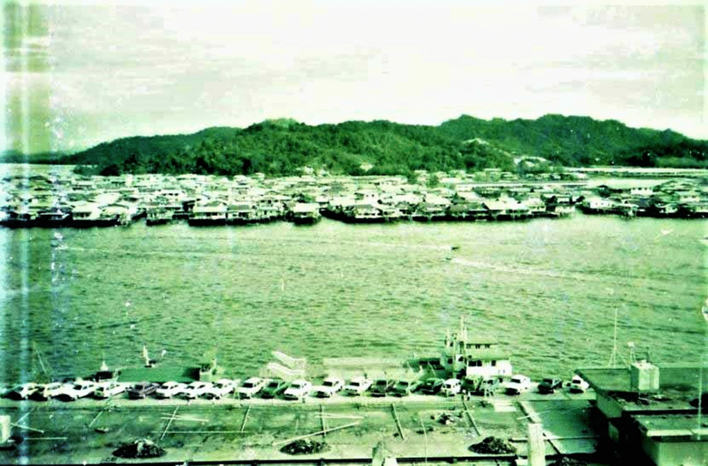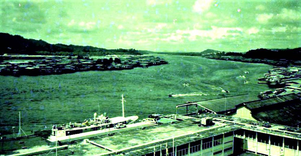 From the land side, you can see the floating village on the opposite bank through the customs office on the riverbank. Photo by author 1982