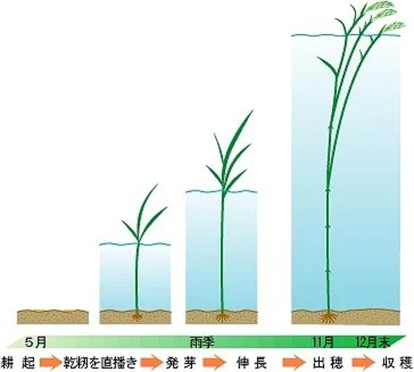 One day, after visiting Cambodia several times, I was intrigued by a local person who told me about the existence of floating rice. It is a type of rice that I have never heard of in Japan.  Floating rice plants are sown directly in the ground when the water recedes from the floodplain. It is flooded by the rising waters of the Mekong River, and as the water level gradually rises, the new leaf part always extends above the water. Even if the water reaches a depth of 4 m, the tip will not be submerged and will be on the surface of the water. When the harvest time comes, the ears of rice are harvested from boats that are out on the water. It is a type of indica rice.