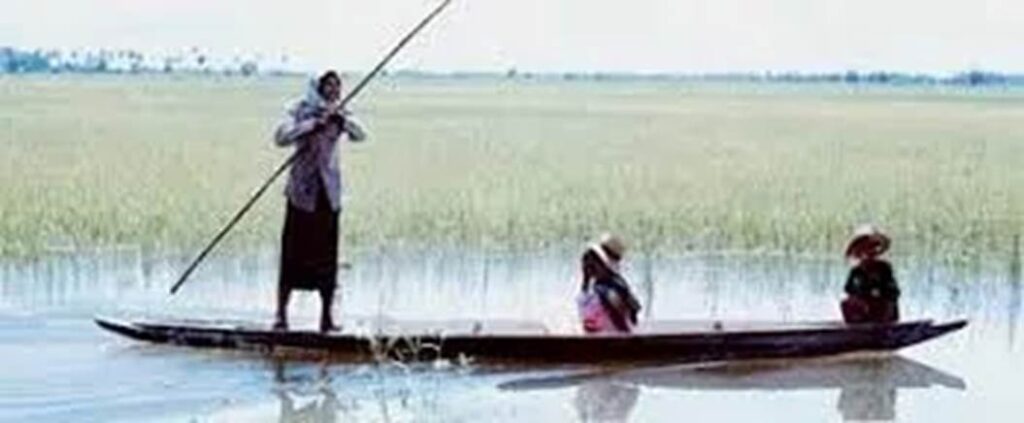 Floating rice on a floodplain. The rice is harvested by cutting the tops of the heads with a cutter from a boat. It is a single crop. The well-irrigated rice terraces in Bali are a triple crop, so it is easy to see how inefficient floating rice is.