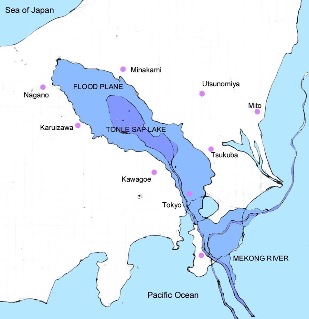 The expanse of the water surface of Lake Tonle Sap during the rainy season is projected onto the Kanto Plain, Japan.