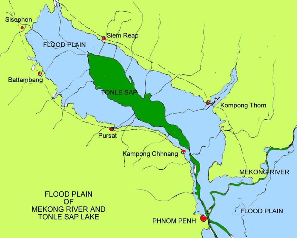 During the dry season, the water of Tonle Sap Lake flows to the right (downstream) and returns to the Mekong River.