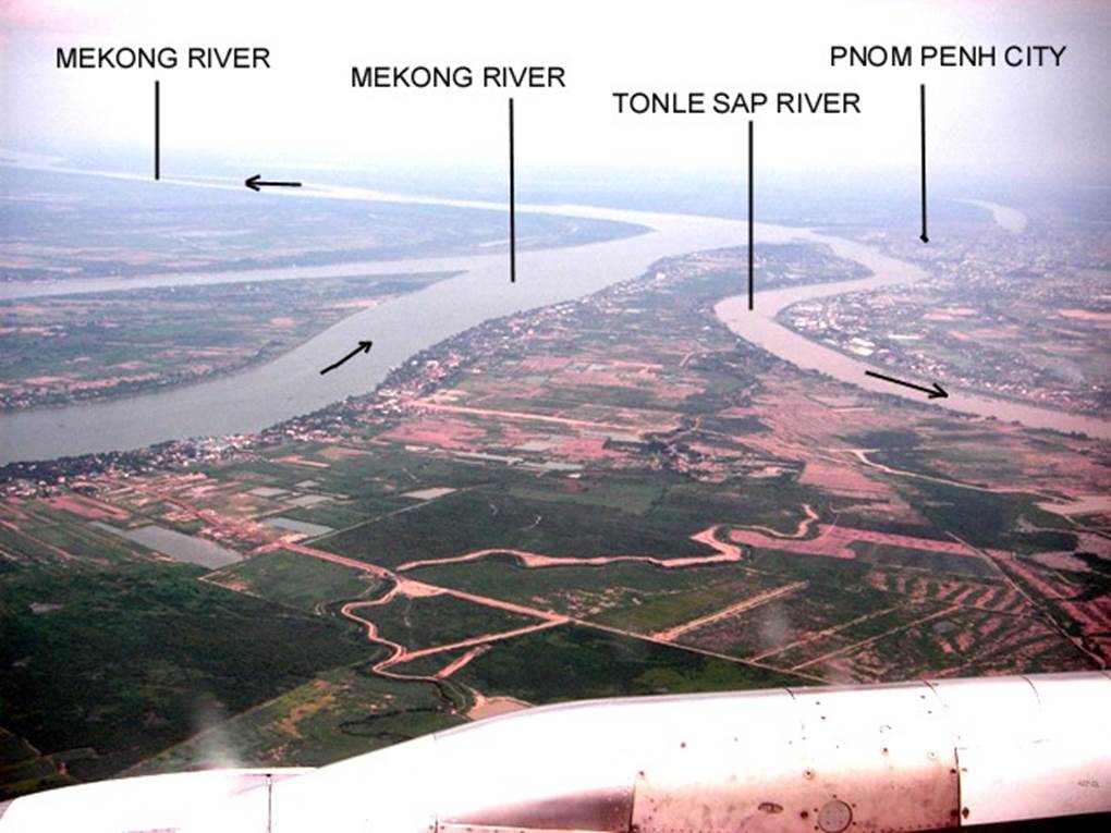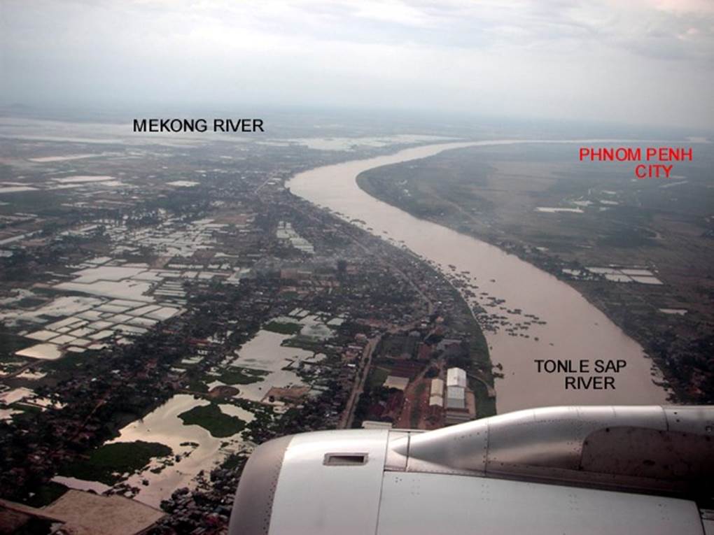 Phnom Penh, the capital of Cambodia, is located on the west bank of the Tonle Sap River, a tributary of the Mekong River, and the capital can be seen from the air surrounded by such floodplains.