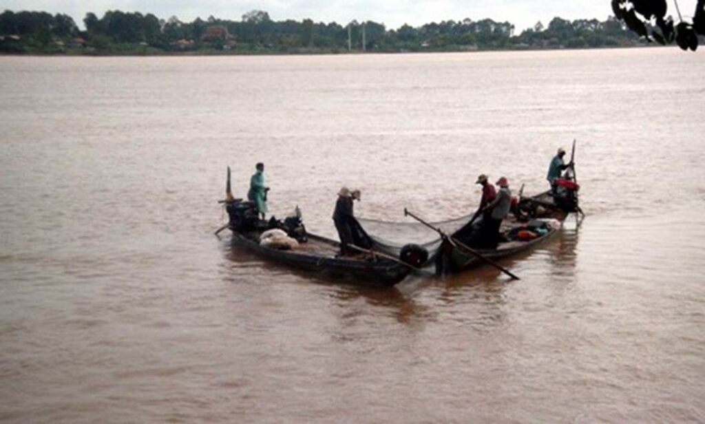 Fishermen fishing on the Mekong River in two small boats