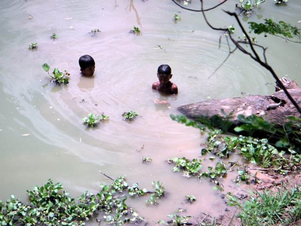 Farmer’s children playing in the water in the creek of the floodplain
