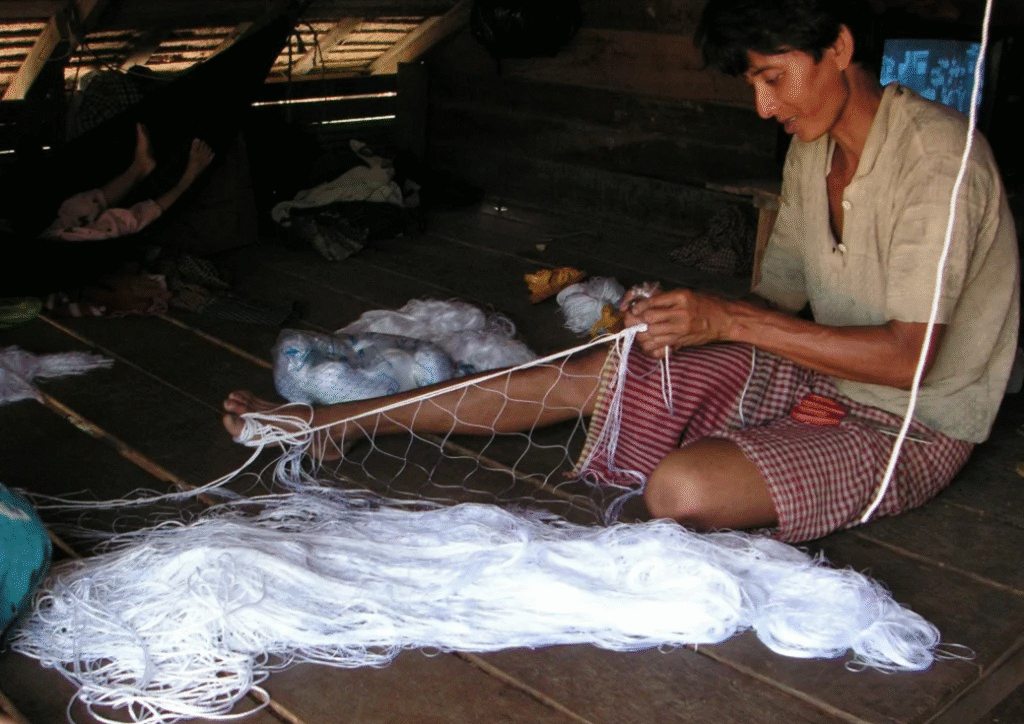 Fishermen in the floodplain making fish nets.