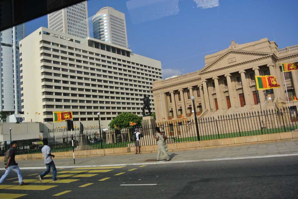 The former colonial Parliament building is on the right, an imposing building located in a prime location in the Colombo Fort district.