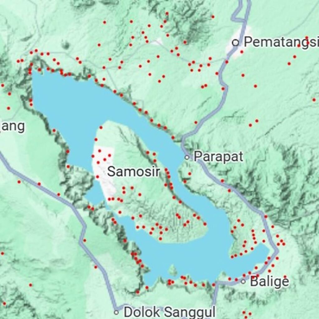 When I plotted the locations of churches near Lake Toba and Samosir Island using Google Maps, I obtained the results shown in the drawing below.