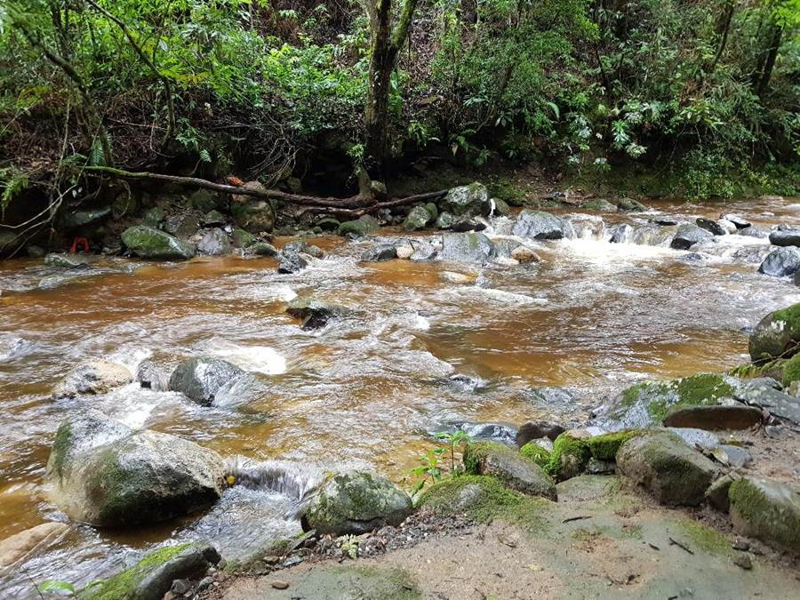 The water seeps out of the dense forest and forms a fast-flowing stream.