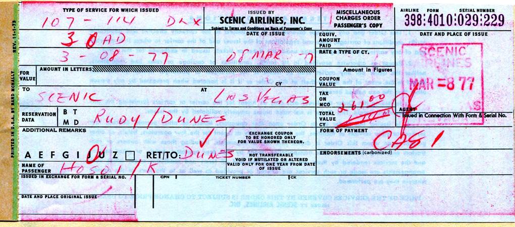 Handwritten tickets for Scenic Airlines. $261. March 8, 1977.