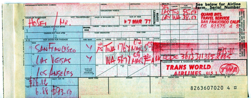 San Francisco to Las Vegas to Los Angeles one-way ticket. March 1977. $93 dollars. The thicket was handwritten, and the receipt was a carbon copy. This was before the age of computers and digitalization.